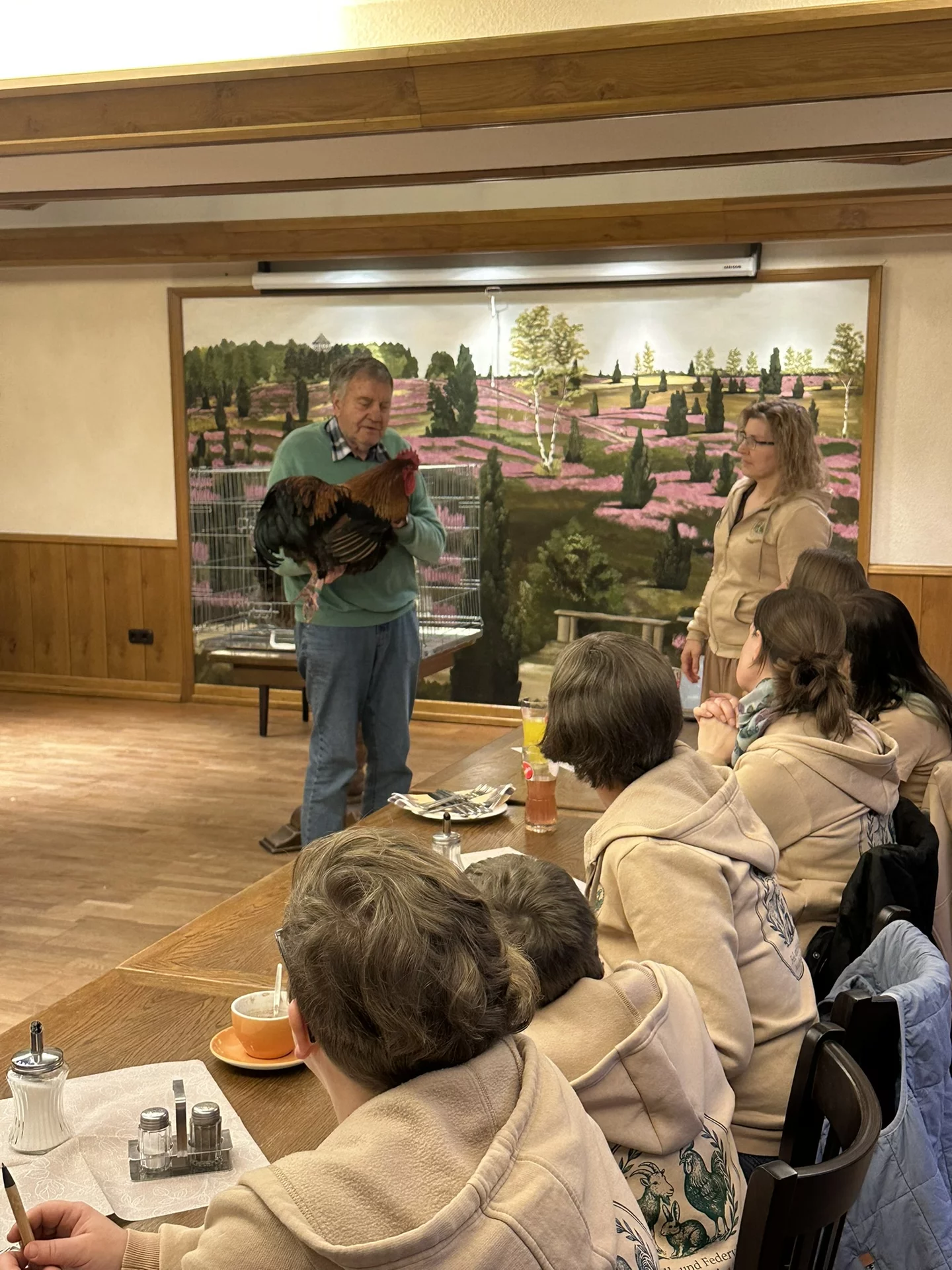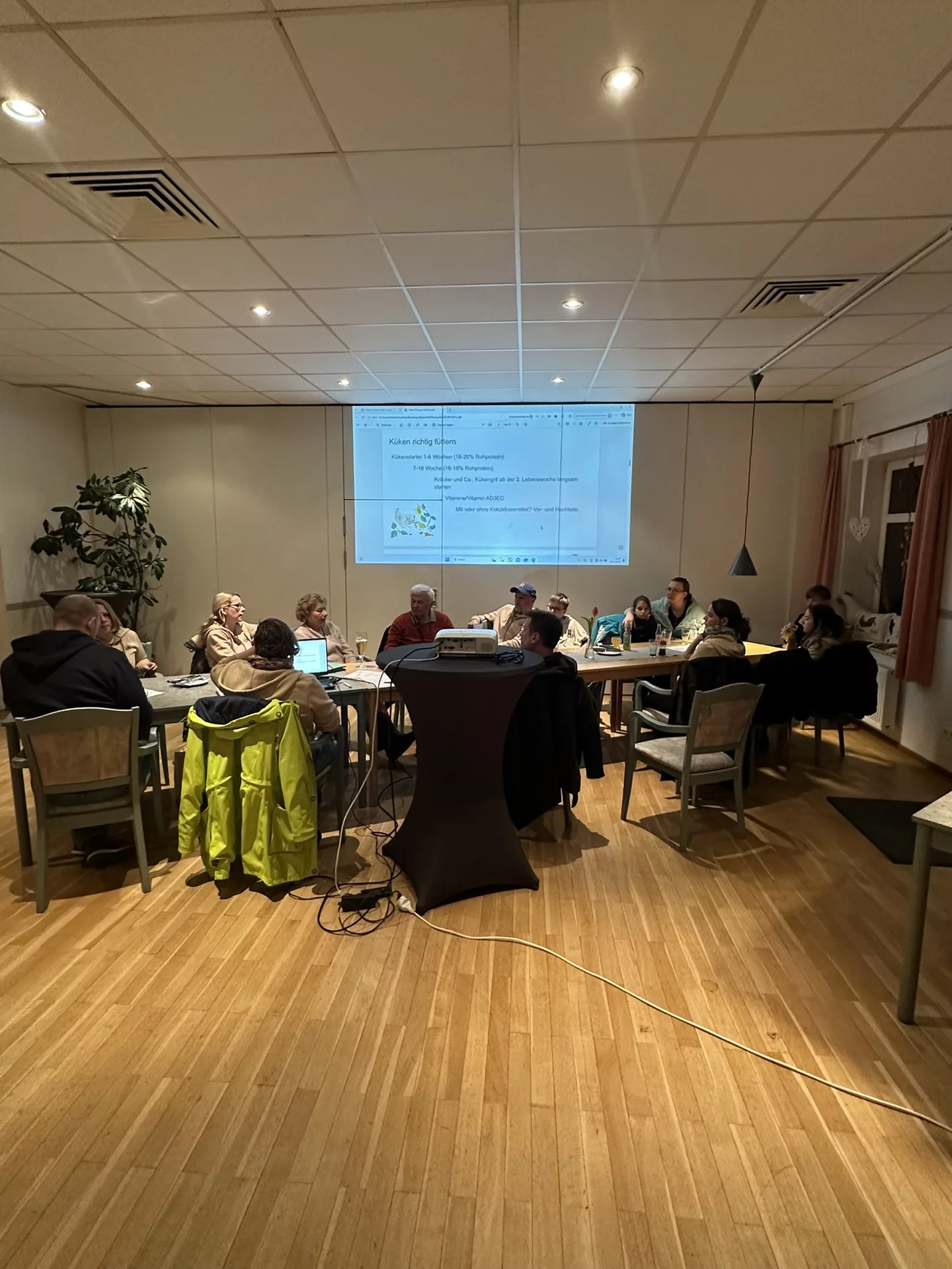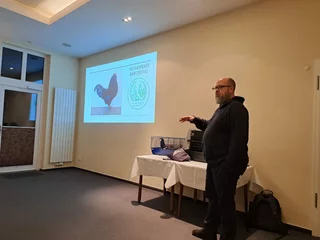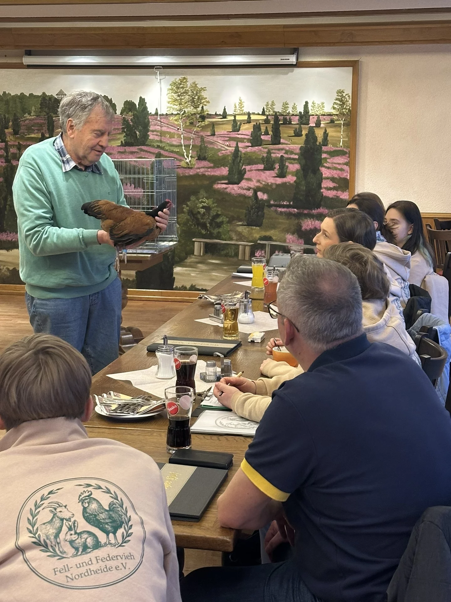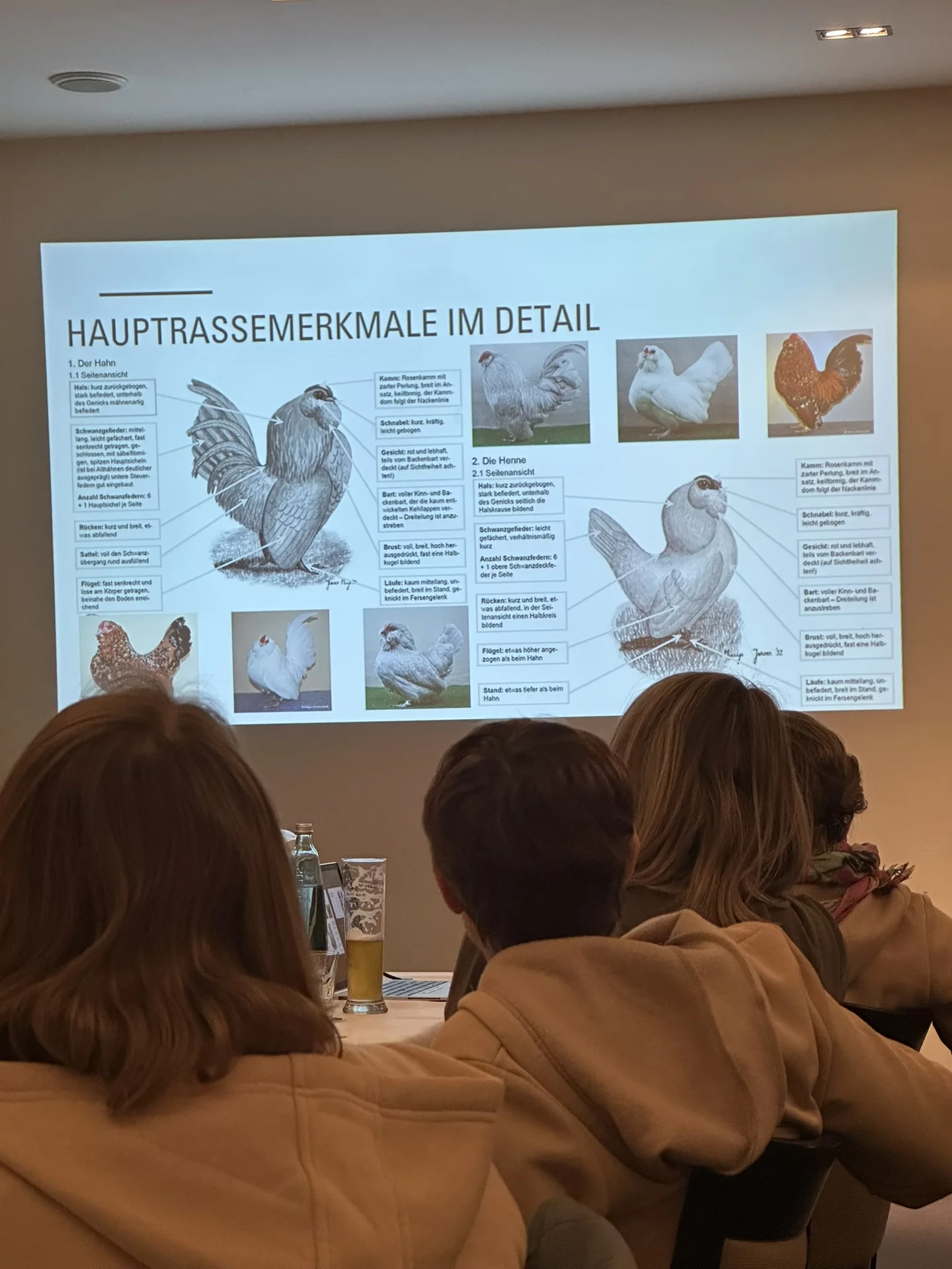 Mit einer weiteren Ergänzung zu unserem Gruppenabend starteten wir die „Infoveranstaltung“. Dazu laden wir externe Referenten und Fachleute ein, die zu speziellen Themen sprechen. Dabei handelt es sich um Inhalte, die nicht alle Mitglieder gleichermaßen ansprechen und daher nicht auf dem regulären Gruppenabend vorgestellt werden. In Zusammenarbeit mit dem RGZV Sittensen widmeten wir uns dem Thema „Zucht, Ringe und Ausstellungen“. Rudolf Meyer, erfahrener Züchter und Preisrichter, vermittelte uns viele interessante Einblicke und wertvolle Informationen. Auch der praktische Teil kam nicht zu kurz: Anhand der Orpingtons, Plymouth Rocks, Araucaner und Zwerg-Vorwerk unserer Mitglieder erläuterte er anschaulich die jeweiligen Rassemerkmale.