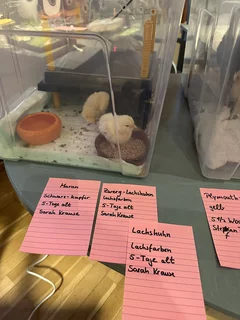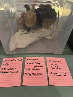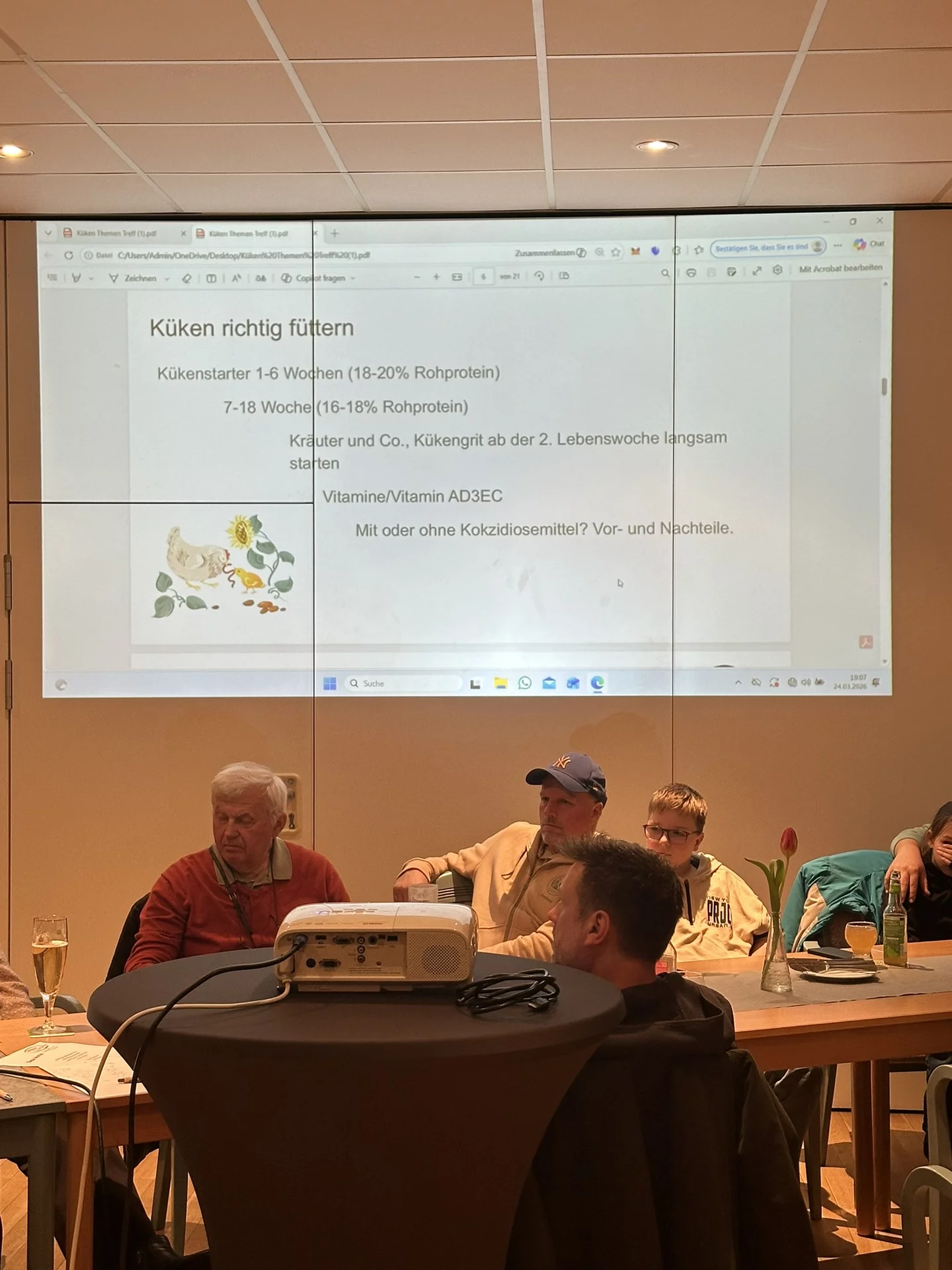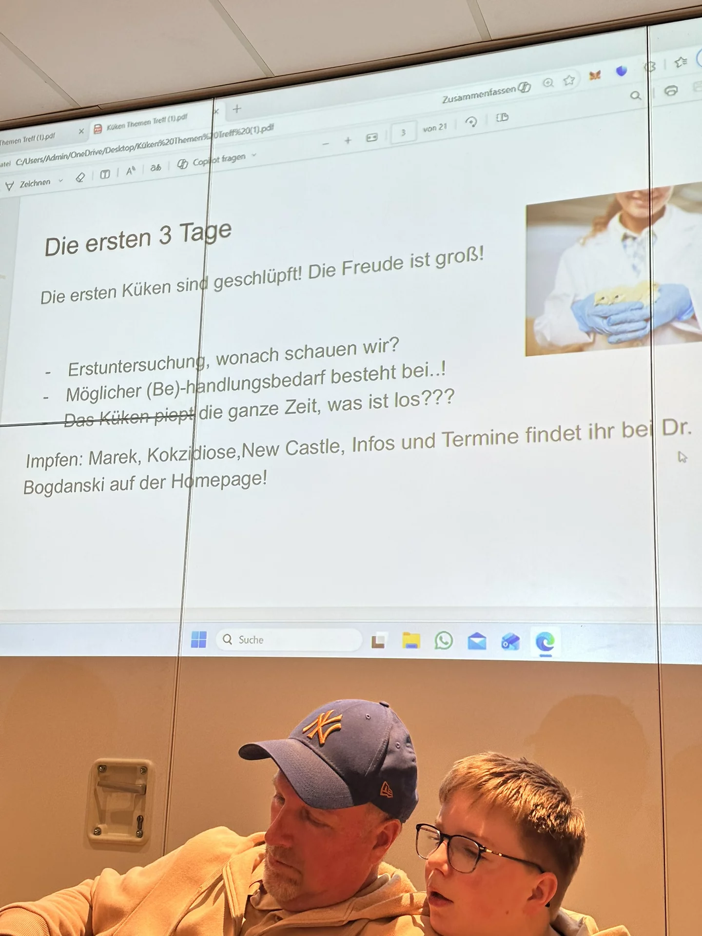 Passend zur Jahreszeit drehte sich beim heutigen Themen-Treff alles rund um das Thema „Küken“. Von der Aufzucht und Haltung über die richtige Fütterung und Impfungen bis hin zu Gesundheitsfragen, Geschlechtererkennung und wichtigen Rassemerkmalen für die Zucht – Sarah gab uns einen umfassenden Einblick in alle wichtigen Bereiche. Dabei konnten nicht nur Einsteiger viel Neues lernen, sondern auch erfahrene Züchter noch die eine oder andere spannende Erkenntnis mitnehmen.Ein besonderes Highlight waren natürlich die mitgebrachten Küken, die bei allen großen Anklang fanden. Unsere Mitglieder und Gäste hatten die Gelegenheit, Küken unterschiedlichen Alters aus folgenden Rassen zu bestaunen: Seidenhuhn, Plymouth Rock, Orpington, Brakel, Marans, Zwerg-Lachshuhn, Lachshuhn, Serama, Ayam Cemani, Strupphuhn und Croat Langshan.