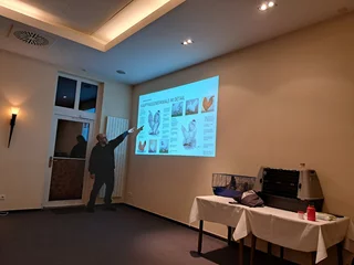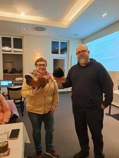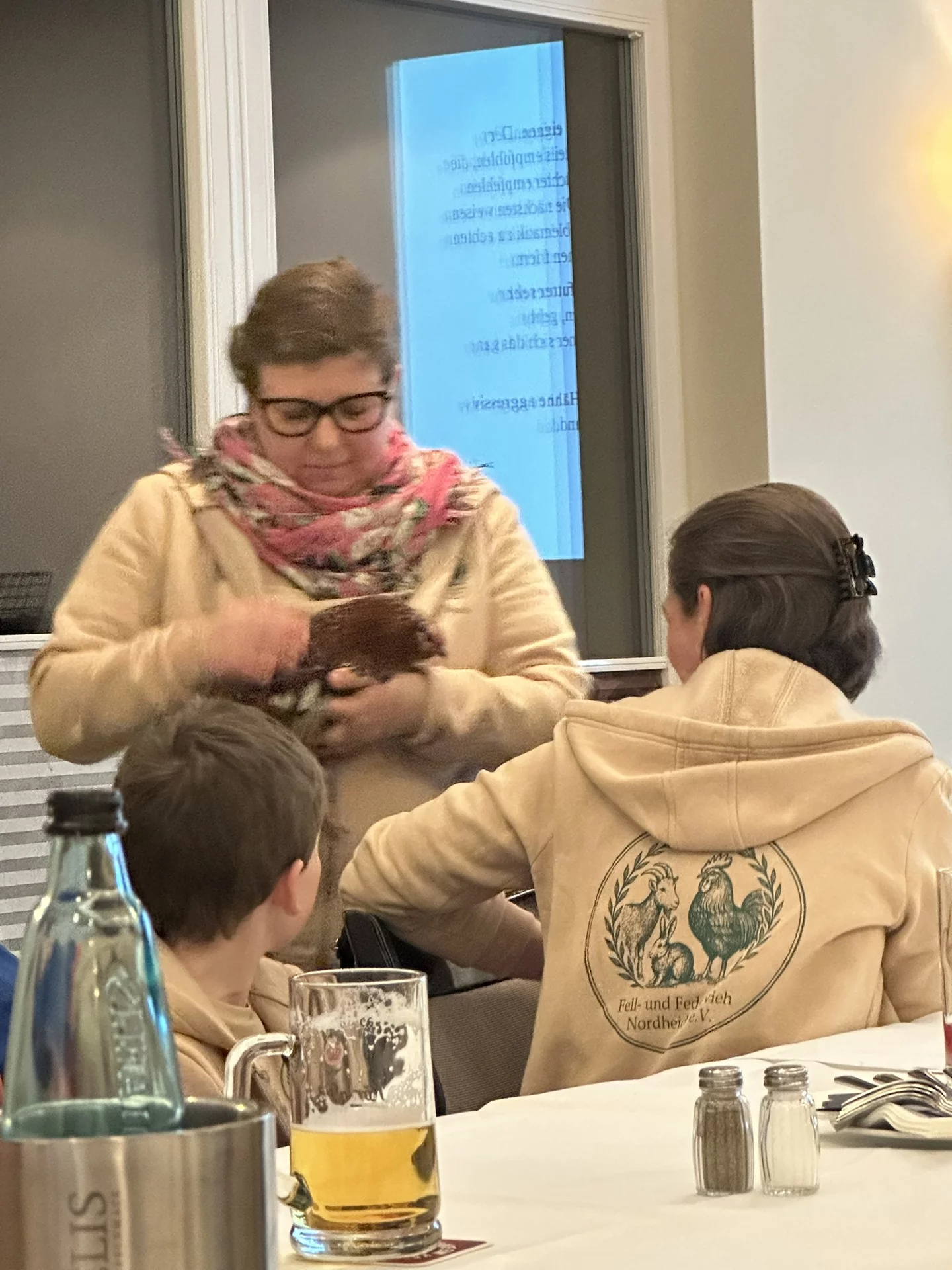 Rieke von der Falknerei Skyfall hat uns auf dem heutigen Gruppenabend besucht und mit Wüstenbussard „Ash“ für große Begeisterung gesorgt. In ihrem lebendigen Vortrag informierte sie nicht nur über die vermeintlichen „Feinde unserer Hühner“, sondern gab spannende Einblicke in das Leben der Greifvögel, die Falknerei und die Jagd. Durch ihre offene und sympathische Art konnte sie viele Vorurteile abbauen, und die fast 40 Teilnehmer nutzten begeistert die Gelegenheit, ihr zahlreiche Fragen zu stellen. Natürlich blieb auch Zeit für vereinsinterne Themen: So tauschten wir uns unter anderem über unseren geplanten Besuch der „Grünen Woche“, die Bestellung der Bundesringe sowie unsere kommenden Aktivitäten auf verschiedenen Stadtfesten aus. Auch hatten wir wieder Gäste, die sofort unserem Verein beitreten wollten.